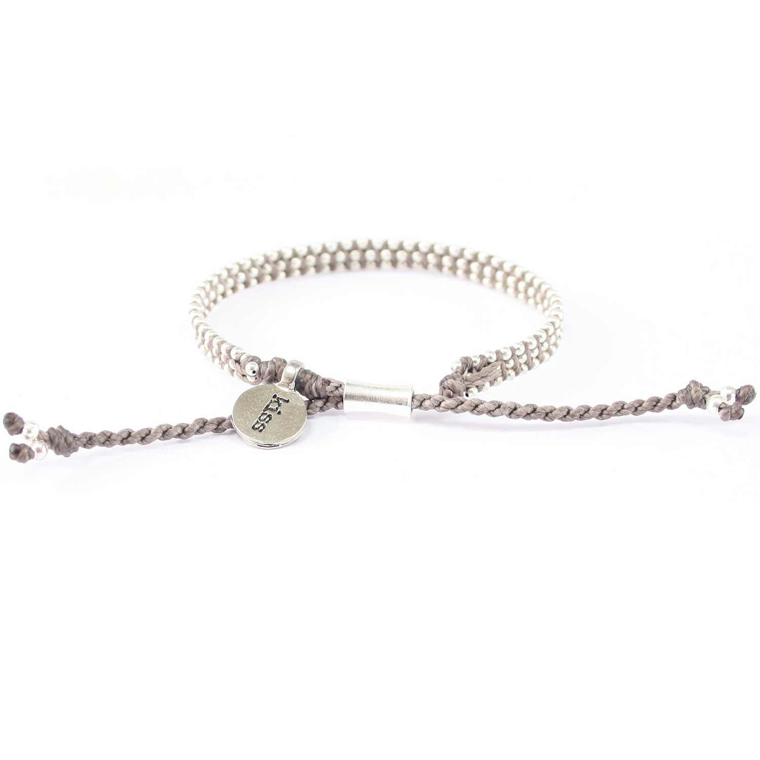 P.S. Kiss är en symbol för en av världens enklaste och mest underbara kärlekshandlingar, som kan ta sig alla möjliga uttryck. Lång, flyktig, vänskaplig, tröstande, stormande… Det finns alltid anledning för en kyss. Här som armband i gråbrunt och silver.