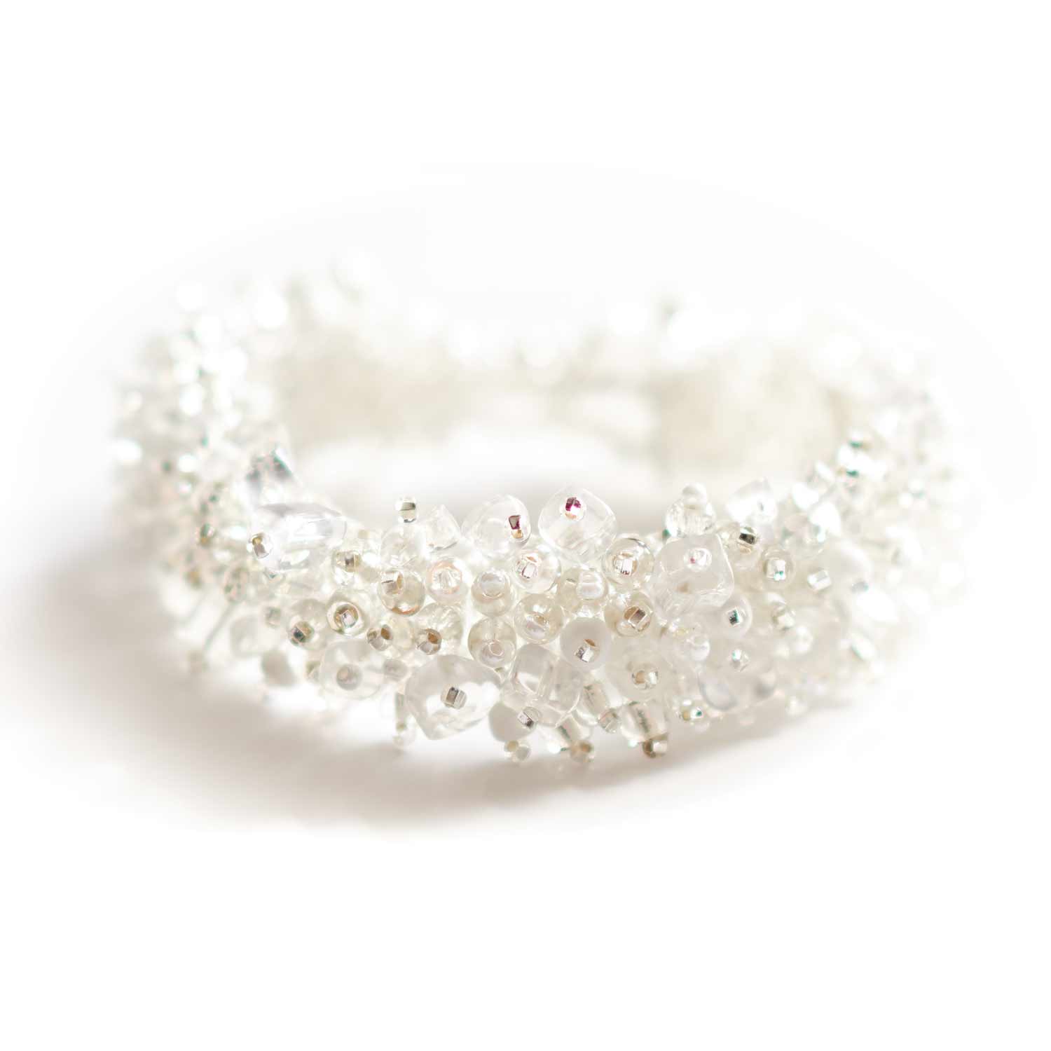 Snyggt, vitskimrande armband med hårt knutna pärlstjälkar. Ett mångsidigt, unikt armband från Guate!Guate med volym, attityd och glans.